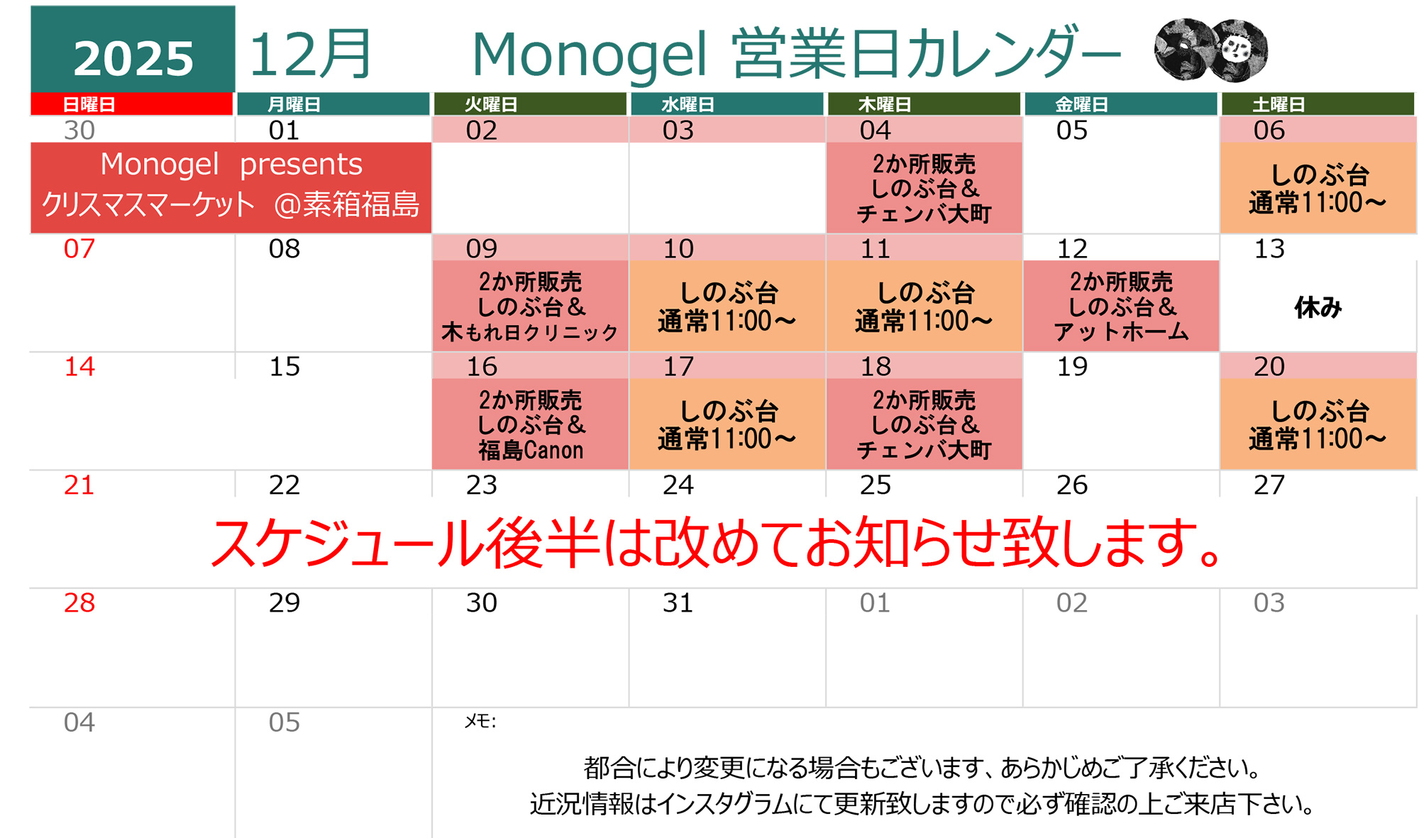 - 毎週火・水・木・土祝日やイベント出店等により休みの場合あり